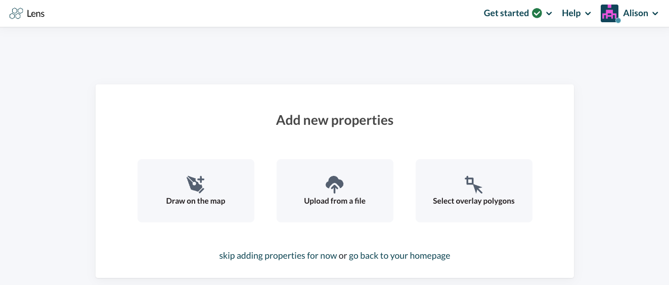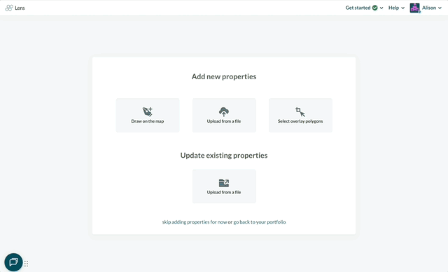 If you’re new to Lens, you’ll be prompted to add your properties from the landing page after logging in. These properties will be added to a new portfolio, and you’ll be able to name your portfolio as part of the upload process (and can always rename it later by clicking the three dots on the portfolio from the landing page).