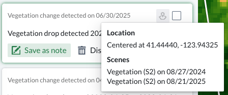 Each notification will also append the data from the latest data scene, and the area of change will be outlined. From there, you can save those notifications as Notes, compare the dataset to true color imagery, plan to make an in-person visit, or follow up in any other way you see fit! If you dismiss the notification, you will not receive further alerts unless the property conditions first fall below and then meet the threshold criteria again.