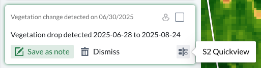 To quickly toggle between datasets when reviewing a Lookout notification, click the S2 Quickview button after hovering your cursor over a notification card. We recommend starting by reviewing Truecolor S2 data, and then reviewing any other datasets that may be relevant for the geography you're monitoring.