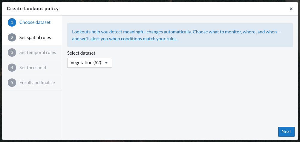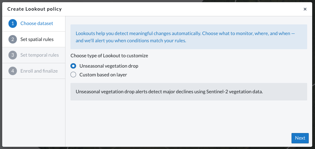Custom Lookout policies can also be created for category datasets like Landcover and Global Forest Loss. With these Lookout policies, you can select changes to specific categories you're interested in, or select "Any" from the dropdown to receive notifications about changes to any of the categories moving forward.