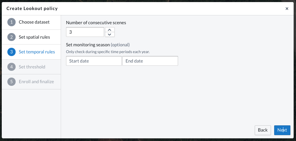 In the "Set monitoring season" field, you can decide if this policy should run during a specific time of year -- perhaps there's a specific time of year where certain activities are more likely to happen (i.e. fire season, harvests). If you set a monitoring season of June 1 - October 1, your policy will automatically run during that window of time each year. The policy will only screen for new alerts during the time window you set. So, if you have set the number of consecutive scenes to 3 and a monitoring season beginning June 1, the first alert you could possibly receive would be on the third sensing after June 1.
