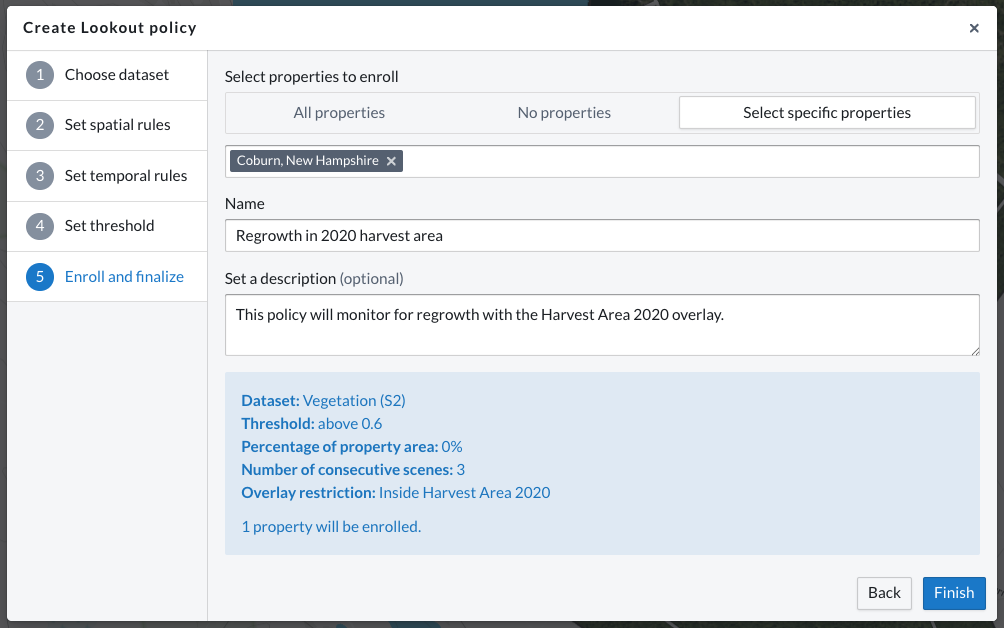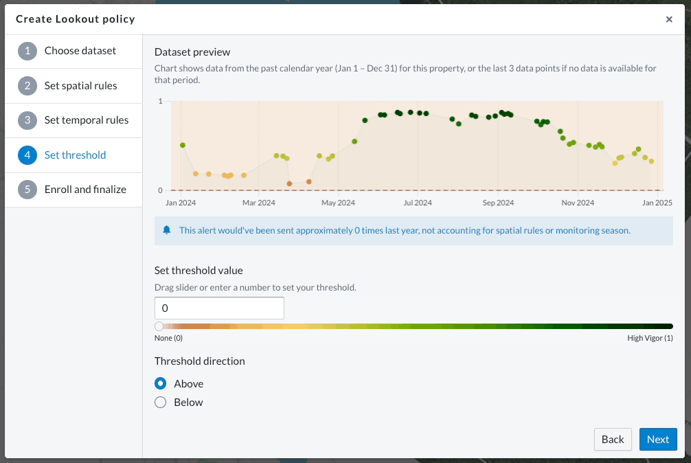 During this stage, you'll preview real data for the property you're working on to help you determine an appropriate threshold for your policy. For our policy to monitor regrowth, we're setting a mid-range threshold value on the scale (0.6) with the goal of catching vegetation regrowth before it reaches maturity. Because this property experiences seasonal leaf-off and green-up, we're looking to set a threshold that's high enough to avoid some of that noise. This chart preview provides helpful information on the average value across the entire property, but please note that it not take the area threshold for the policy into account. Therefore, small portions of your property could be much higher or lower than the average and trigger more alerts than the chart suggests.