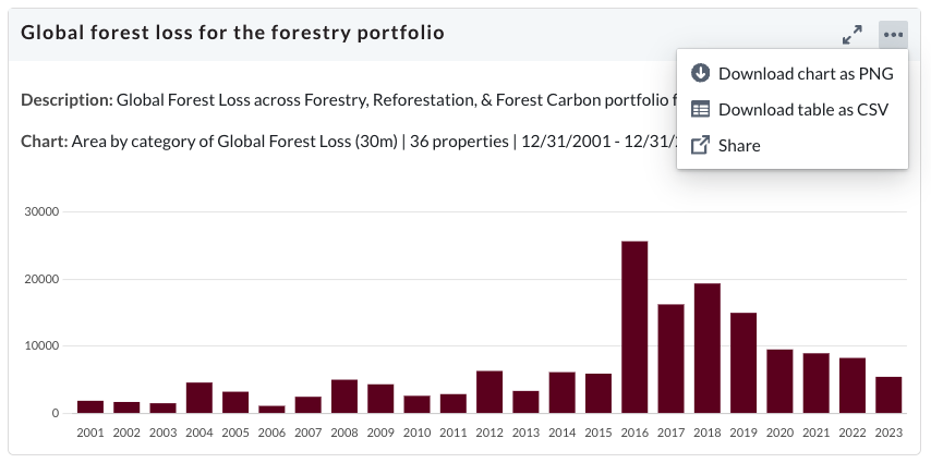- Aggregate trends across properties (e.g., average canopy cover, carbon stock totals, or land cover change)