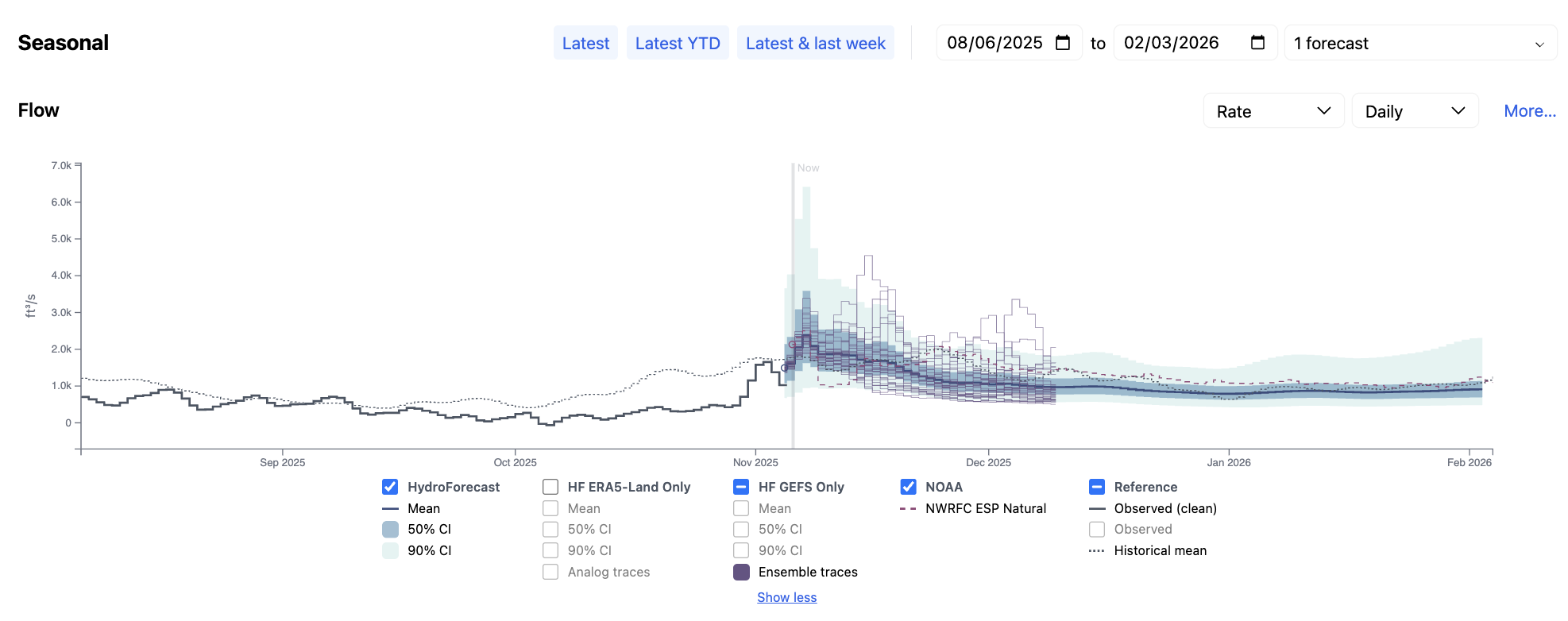 HydroForecast Seasonal and Annual forecasts are probabilistic, meaning they represent a range of possible futures rather than a single outcome. Each forecast includes a mean streamflow value and confidence intervals (quantiles), as well as multiple ensemble traces tied to different weather inputs (e.g., NOAA GEFS or ERA5).