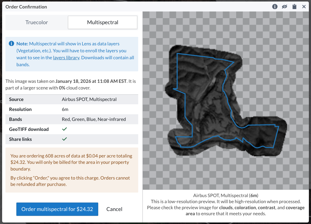Similar to truecolor imagery orders, you should check for cloud cover and ensure the capture date meets your needs.