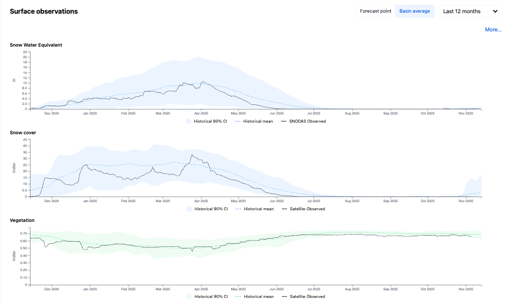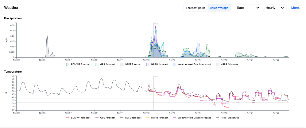 Uncertainty in model outputs is largely driven by variation in the input weather forecasts. For this reason, we provide all of the meteorological forecasts used as inputs into the model as well. These are visualized in the dashboard just under the short-term inflow forecast. The plots default to showing the weather at the forecast point. To adjust this view for a more comprehensive understanding of the local weather, click on Basin average to see the weather averaged across the basin, as shown in the plot below.