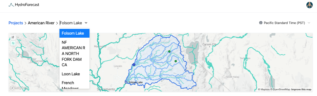 HydroForecast's web dashboard consists of one or more projects. When you first sign in, you'll see a list of your organization's projects. After selecting a project, you'll be able to see the forecasts for that region. The top section is comprised of a map showing the forecast locations for the project, along with their respective catchment areas and sub-basins. You can select a forecast location by clicking the map or by using the dropdown menu, as shown below: