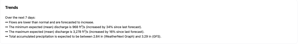 Above the short-term flow forecast section you can generate a smart summary. This summary will give an overview of how current flows compare to the long-term average ('normal') and some details about the current forecast and precipitation.