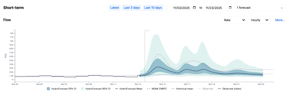 The next section shows the HydroForecast Short-term flow forecast followed by the temperature and precipitation forecasts. The menu offers controls to select which forecasts to display. Along with the mean forecast, confidence intervals are also provided to let customers decide which forecast to use based on their internal level of risk tolerance. Under normal circumstances, we also recommend the mean forecast. If, for example, there is a high deviation between the input weather forecasts, a different confidence interval may be more appropriate. Read more about our confidence intervals and how to use them here.