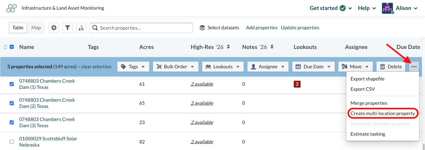 Use our “Update properties” tool to modify or merge property boundaries within your portfolios. All notes will be migrated to the new property area and any imagery purchases you’ve made that overlaps with the new boundary. If you need to split an existing property boundary, please reach out to lens@upstream.tech for support.
