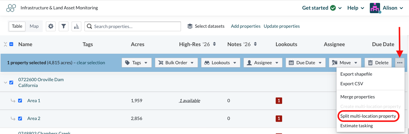 To split locations in an existing multi-location property, select some or all of the locations in the multi-location property. Then, click the ellipsis button and select "Split multi-location property". You'll be prompted to confirm the split, and then each location will become a unique property.